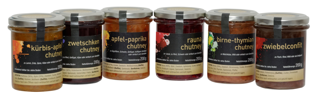 Chutneys, z.B. Birne-Thymian, Apfel-Paprika, Kürbis-Apfel, Zwetschke, Zwiebelconfit